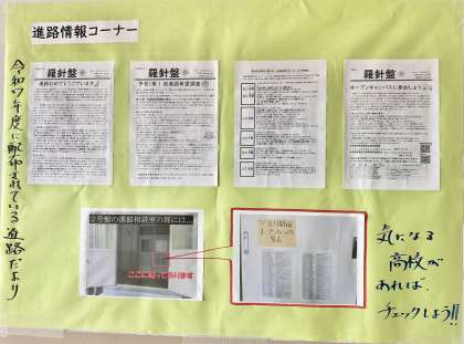また、進路コーナーも出来ました。三年生に配布する進路便り『羅針盤』を掲示しています。まだ先に思われる進路ですが、ぜひ進路便りから、今からできることや日々を頑張るためのヒントを見つけてみてくださいね。