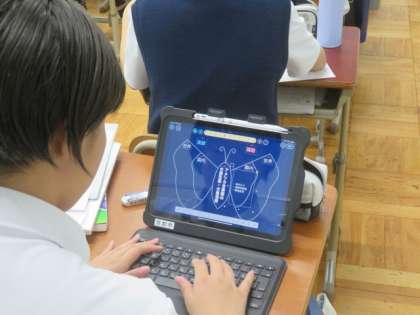 1年生の社会・理科の授業の様子です。社会では、自分の考えを整理し、見えやすい形で表現するために役立つ、シンキングツールをiPadで作っています。トピックに対する賛成と反対を暗示する、バタフライチャートを使用しています。