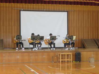7組が、体育館で文化祭リハーサルをしている様子です。ギター演奏と歌唱に取り組んでいます。ギターが弾けるなんてすごいですね。弾いてみたいけど、なかなかハードルが高くて…という人が多いのではないかなと思います。この機会を大切にして、上手になってほしいです。また、発表も楽しみです。