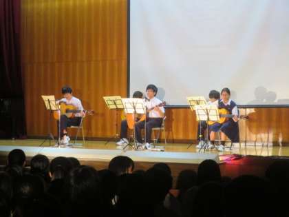 創作部は、自分たちで作成した作品を披露し、人権の大切さを伝えています。また、7組はギターの演奏と共に歌も歌うという、難しいことにチャレンジしています。