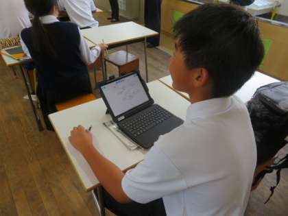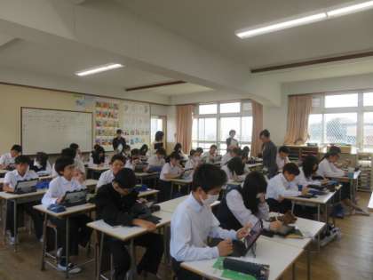 1年生の美術の授業の様子です。「世界にひとつだけの花を咲かせよう」という題材で、今日は、世界にひとつだけの花を今の自分から想像し、「線」や「形」や「色」で表してみようという目標のもと、授業が展開されています。他校からも美術の先生が見に来て下さいました。積極的に発言する姿もステキです。