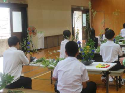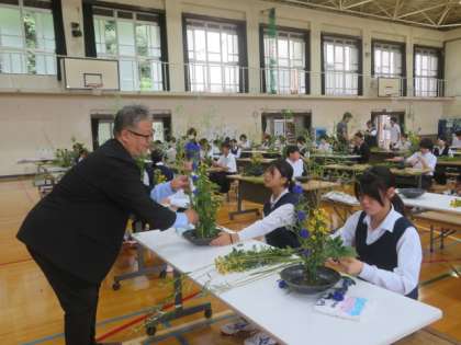 京都未生流の家元、松本司様にご来校いただき、華道を丁寧に教えていただきました。多くの生徒は初めての体験。とても興味を持って取り組んでいます。
