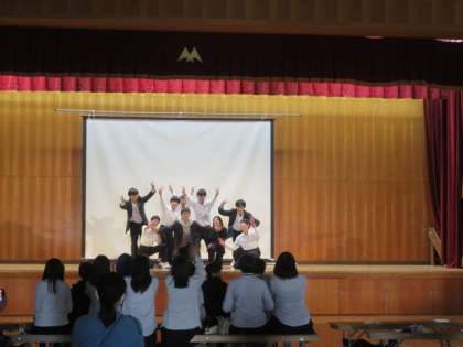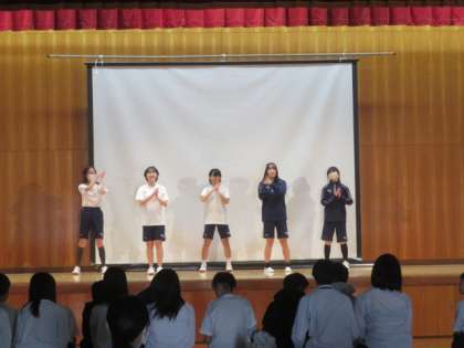 1年生の保健体育の授業の様子です。今まで取り組んできたダンスの発表を体育館でしています。緊張しながらも、一生懸命…。また、見ている側もとても温かい…。よく頑張りました!