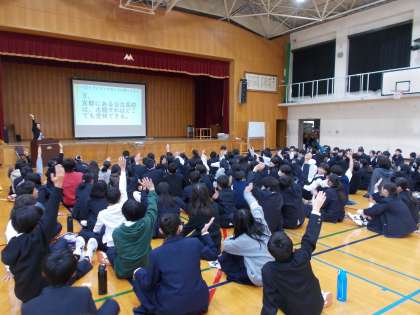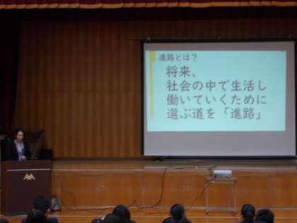 体育館にて、1年生は進路学習を行いました。進路指導主事の先生から「進路」って何だろう?今、みんなが頑張るべきことは何だろう?2年後には義務教育を終えて、自分はどこに進むんだろう?と、色々と考えさせられるお話をしていただきました。まずは自分自身をしっかり見つめ、自分の人生を幸せにするために、今、学習をコツコツ頑張ってほしいと思います。