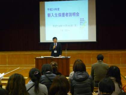 26日(月)本校入学説明会を実施しましたところ,100名の新入学予定の保護者の方が,雨の中参加していただきました。1年間の中学校生活のビデオを見ていただき,学校教育目標・経営方針・進路状況等の説明後,教務主任から学校生活全般について,また,補導主任から生徒指導関係の説明をしました。一人でも多くの生徒さんが入学してくれることを祈ってます。