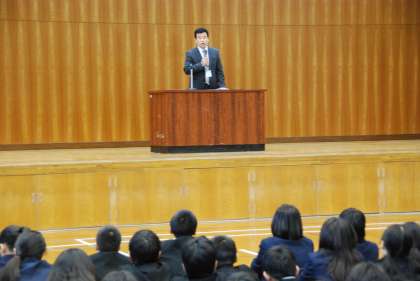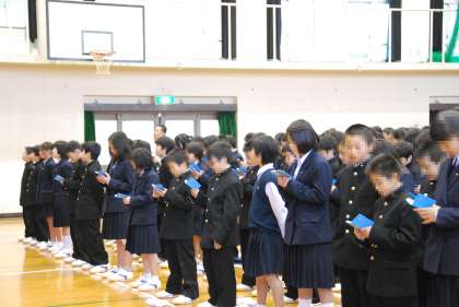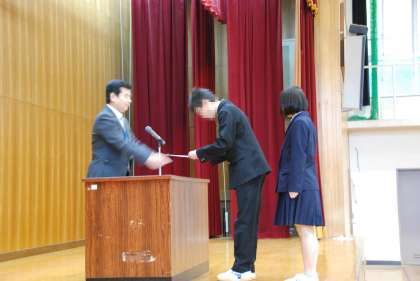 24日(水)6限,全校生徒が体育館に集合し,生徒会主催で認証式が行われました。昨年度から全校生徒が集合する時には,必ず,校歌を歌うことにしました。1年生は,まだ習っていませんでしたが,生徒手帳を見ながら,先輩と一緒に頑張って歌っていました。最後に,校長先生から「生徒会活動は,みなさんの学校生活をよりよく,充実したものにするための活動で,生徒会活動の基本は,毎日生活している学級での活動です。話し合いのできる学校,少数意見を尊重する学級,決まったことをみんなで実行する学級が生徒会の基本です。活力ある生徒会活動を展開している学校は魅力ある学校だと思います。・・」という励ましの言葉で認証式は終わりました。