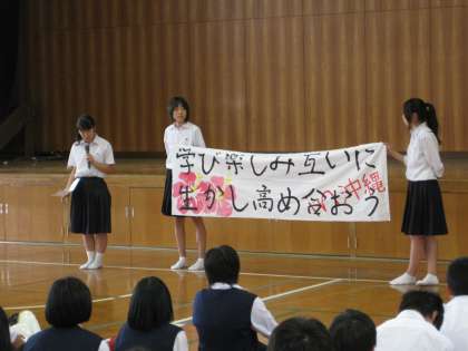 修学旅行委員会の進行で始まった会は学校長、修学旅行委員長の挨拶に続き、学習部から「横断幕」が披露されました。「学び楽しみ互いに生かし高め合おう in沖縄」のテーマが掲げられ、クラスや学年で団結し、集団としててきぱきと行動して充実した楽しい修学旅行にしていくことを約束しました。