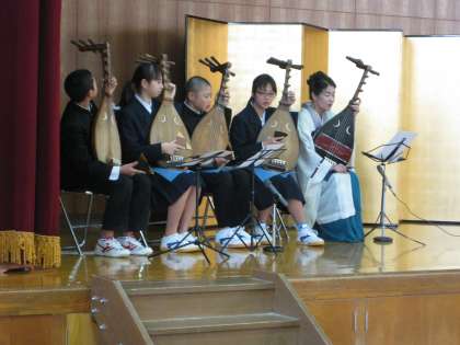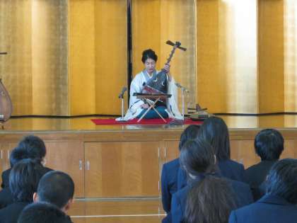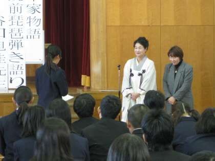 講師は筑前琵琶橘流日本橘会師範の谷口旭佳先生。筑前琵琶の解説で始まったとくべつ授業は、2年生の国語の授業でまさに学習中の『平家物語』冒頭文と「扇の的」を扱ったものでした。平家物語が書かれた鎌倉時代、人々は琵琶法師によって語られる平家滅亡までの物語に耳を傾けて、時には胸を躍らせ、時には感動の涙を流したはずです。今日の谷口先生の琵琶の演奏と語りによって、平家物語から人物の息遣いを感じ、それが語られた時代に思うを馳せることができたのではないでしょうか。また、谷口先生の指導で代表生徒4名が琵琶演奏を体験しました。演奏もさることながらずっしりとした琵琶の重量感に圧倒されそうになっていました。このような優れた文化芸術の魅力に触れ、今後の学習により一層興味・関心を持つきっかけとなりました。