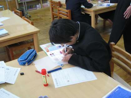 公開授業として行われた1年生数学の公開授業は、たくさんの参観者に見守られ、いつも以上の緊張感の中、「平面図形」の単元の学習に臨みました。グループごとに話し合いをし、目的に応じて図書資料を見つけ出し、自分の意見としてまとめ発表していました。