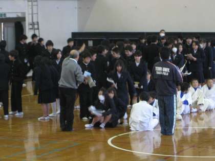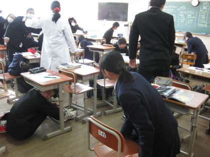 4限授業中に震度5強の地震が発生したとの想定のもと、緊急地震速報の音を合図に、生徒は一斉に机の下にもぐり、体を保護しました。その後、放送の指示に従い体育館へ避難しましたが、所要時間は平均して約5分。大変速やかな避難となり、今までの訓練や授業の成果の表れといえます。来月は右京消防署をお招きしての、訓練が予定されています。