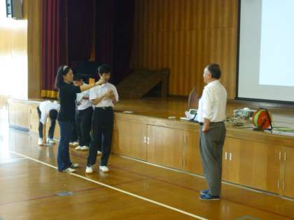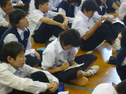 1年生は壁新聞の制作に向けて,出前授業を行いました。読売新聞大阪本社広報宣伝部の宇川さんをゲストティーチャーとしてお招きし,新聞の制作の流れを説明していただきました。また,各クラスより代表して,取材体験をしました。宇川さんを相手にインタビューによる取材の方法を学びました。1年生全体は,新聞社よりいただいたメモ帳にメモを取りながら,内容を熱心に聴き取っていました。