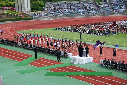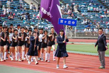 第57回京都市中学校春季総合体育大会総合開会式が,西京極総合運動公園陸上競技場で開催されました。少し曇り空ですが,行進が始まった頃には強い日差しとなりました。全市91校,7,000名を超える中学生たちの入場行進は壮大なスケールでした。