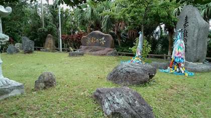 嘉数の高台到着。沖縄戦では激戦地となり,多くの犠牲者を出したために建てられた塔。公園内には地球儀をイメージした展望台があり,残波岬や普天間基地を見ることができます。3年生は,京都の塔を参拝し,高台から普天間基地を見学しました。