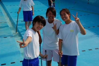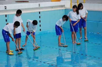 6月中旬からのプール授業に向けて「プール清掃」を行いました。本日の天候(雨?)を心配していましたが,天気も良く1・2・3年生体育委員と教職員が,プールサイドとプールの中に分かれ,とっても美しく掃除することができました。きれいになったプールでクロールや平泳ぎにチャレンジしてください。
