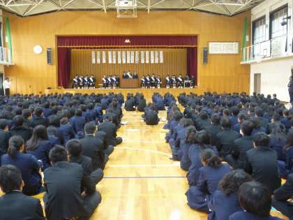 ただ今,生徒会本部役員立候補者による「立会演説会」を行っています。民主的な社会の仕組みの一つを疑似体験し,立候補者の演説を聞き,有権者がその一票をどう投じるかをじっくり考えるための機会です。立候補者は,「この学校が大好きです。みんなの笑顔のように良い学校にしたいです」など,良い学校づくりを目指して,自分たちの思いを全校生徒に語りかけてくれていました。また,応援弁士は,立候補者の優れているところを訴えかけていました。教室に戻って各自で投票を行い,4日には新しい本部役員が誕生し,3年生から1,2年生へとバトンが引き継がれていきます。
