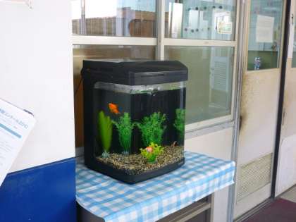 職員室の入口の横には掃除用具BOXと大きなゴミ箱がおいてありましたが、それらを異動し、水槽をおくことにしました。倉庫に眠っていた水槽をきれいにし、教職員の方といろいろ考え、水槽の中をレイアウトし、金魚を飼うことにしました。生徒たちだけでなく、保護者の方からも「いいですね」とか「癒されます」と好評です。