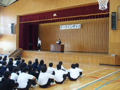 5時間目に第1回「トークイン双ケ丘」を行いました。「トークイン双ケ丘」は,年間5回全校集会などの生徒会担当の時間に,各クラスの代表がスピーチを行います。第1回目のテーマは,「中学生になっての意気込み」「2年生になって」「3年生になって」でした。この取組は,自分の意見や考えをまとめ,全校生徒の前で発表することで表現力やコミュニケーション力を高めることをねらいにしています。また,聴く側も他学年の生徒の意見を聴いて自分の考えを振り返る機会になります。発表する生徒も聴く生徒も真剣な表情が印象的で,好感がもてました。第2回が楽しみです。