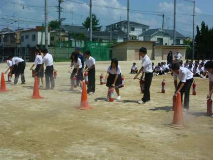 8日(木)5限に消防署から消防隊に来ていただき、避難訓練を実施しました。非常ベルがなり、「訓練、訓練、直ちにグラウンドに避難して下さい」の放送で、全校生徒が、移動を開始しました。グラウンド集合後、隊員の方から「静かに、整然と移動できました」と言っていただきました。その後各学年ごとに、担架の作り方、消火器の使い方、バケツリレーの仕方などについて隊員の方から丁寧にご指導していただきました。災害はいつどこで起こるかわかりません、常日頃から防災意識をもつことの大切を学んだ避難訓練でした。