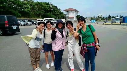 離村式に向けて、集合時間が近づいて来ています。民泊を終え、少しずつ伊江港に生徒が集まって来ています。天気は、晴れ。
