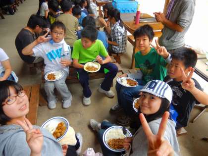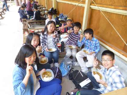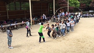 1年生の「大森リゾートキャンプ場」での「飯盒炊さん」・「大縄跳び」の様子です。自然に囲まれた中で、調理の準備や薪割りをみんなで協力し活動しました。帰りのバスの中では疲れて寝ている人もたくさんいました。