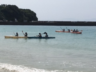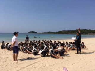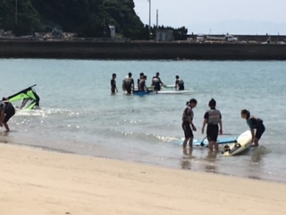 今日は壱岐での体験学習です。これからイカの一夜干し体験とマリン体験に分かれます。このクラスはウェットスーツに着替えて筒城浜へ。晴天のの中,青い海に感動です。魚が泳いでいるのが見えます。インストラクターの方々に教えていただきながら楽しく体験学習です。