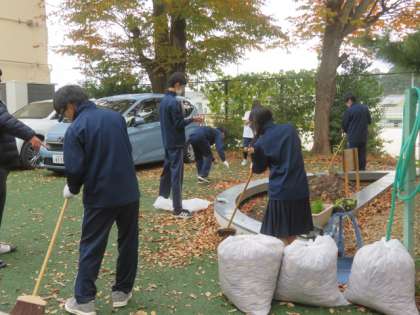寒さも深まり、大量の落ち葉が地面に広がる季節となりました。7組の生徒たちで、落ち葉の回収をしてくれています。特に校内で多くの人が通る場所を中心にやってくれました。本当にありがとうございます。また、3年生は職業学科の入学相談が明日あります。そちらも是非、頑張ってきてほしいと思います。