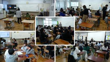 午後から、御室小・宇多野小・花園小・高雄小の6年生の児童のみなさんが、中学校の体育館に集まってくれました。生徒会本部のみんなで学校紹介やアイスブレーキングをしてくれました。そして、各教室に分かれ、中学校の授業を体験してもらいました。みんな聞く姿勢がとても素晴らしかったです。