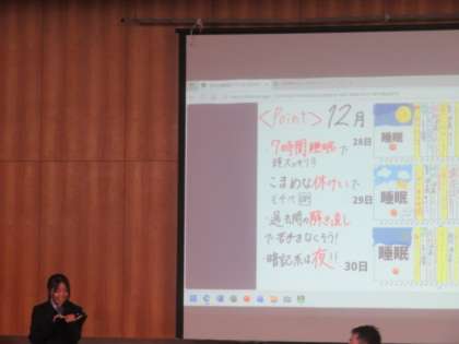 各学年、学年集会を実施し、今年を振り返っています。学年ごとに評議員が工夫をし、実施しています。写真は3年生の様子で、冬休みの過ごし方の提案を行っていました。