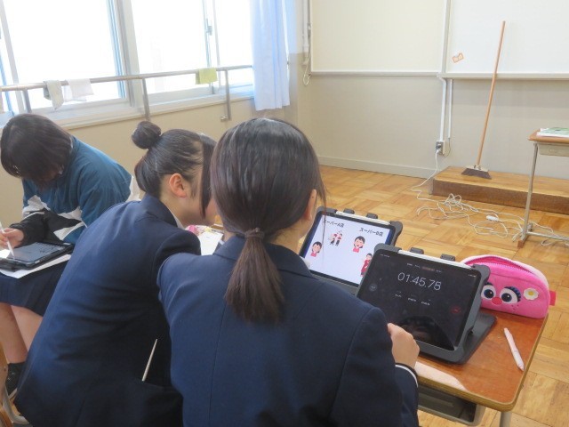 2年生の総合的な学習の時間では、11月下旬にあったチャレンジ体験で学んだことを、1年生に向けて発表する、チャレンジ体験発表会に向けて、現在資料をまとめています。ロイロノートを使って、各事業所ごとに資料を作成し、どのようにわかりやすく発表していくかも話し合っています。端末に原稿を打ち込む人もいれば、手書きで書いている人もいます。この学習を通して、自分の将来もじっくり見通してほしいと思います。