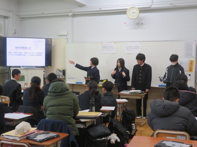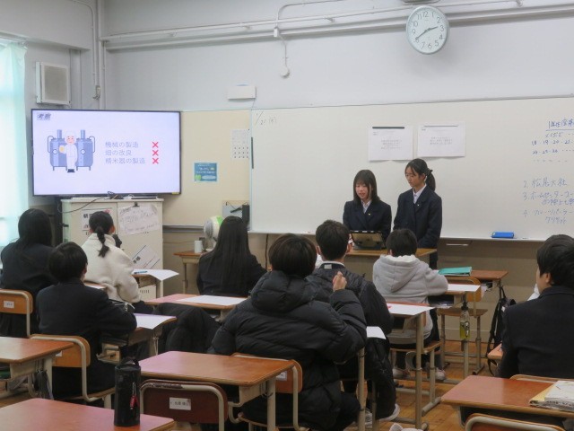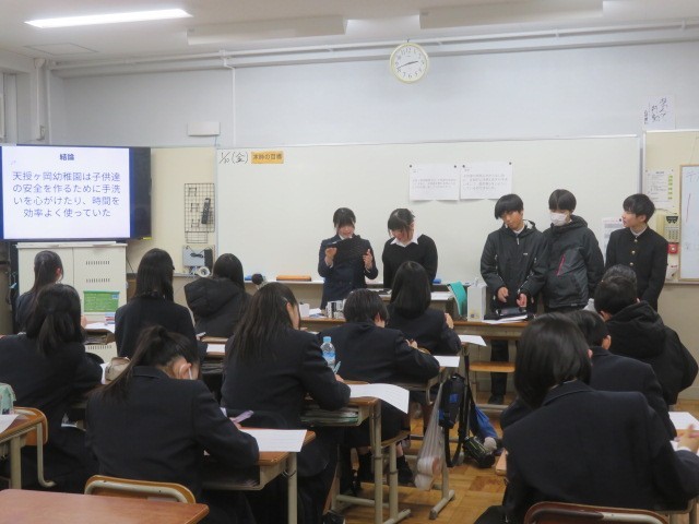2年生がチャレンジ体験に行く前に、疑問を出し合い仮説を立て、実際にチャレンジ体験を行なってわかったことや学んできたことを、1年生に向けて発表しました。事業所別で資料を作成し、発表原稿を考え、どのように伝えたらわかりやすいかを考え、工夫を凝らして頑張りました。1年生も静かに真剣に、先輩の発表を聞き、質問も投げかけていました。
