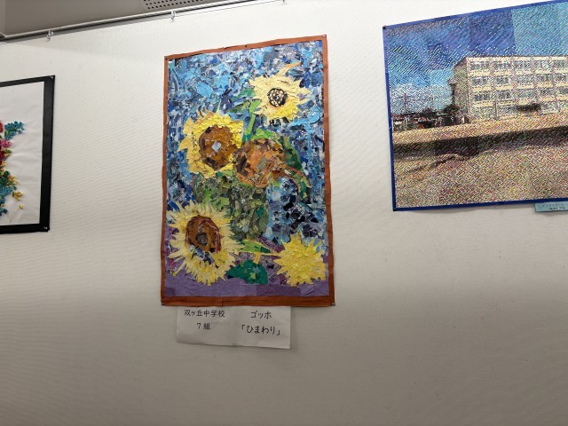 7組は校外学習で小さな巨匠展に行きました。7組みんなで作ったゴッホの「ひまわり」が展示されています。スーパーのチラシや雑誌を再利用して、一生懸命作りました。公共交通機関を利用して、安全に気をつけながら行って帰ることができました。