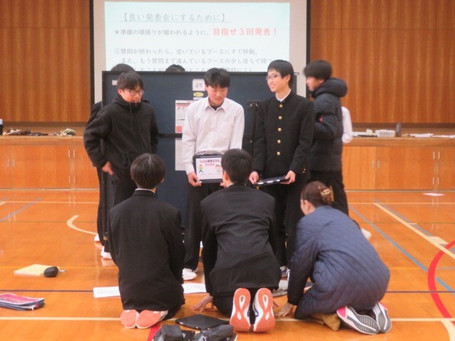 2年生は、学年内でチャレンジ体験のまとめの交流会を、体育館で実施しました。PowerPointを使って探究してきたことを、発表したり、質問しあったりしました。他の事業所での仕事の様子等を知り、自分が体験してきたことと比べたり、新たな問いが生まれたり…。とても有意義な交流会になったと思います。