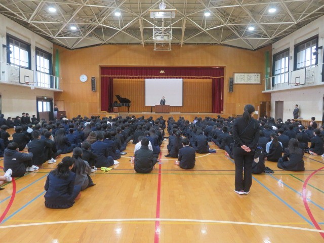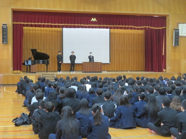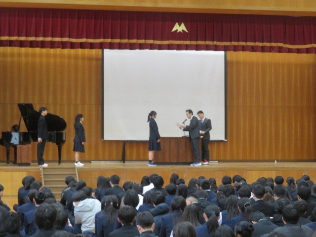 今年度の修了式を体育館にて行いました。校長先生や生徒指導部長、そして生徒会本部からの話があり、最後に表彰を行いました。その後、教室等を大掃除しました。そしてこのクラス最後の学活を、担任の先生と仲間と共に過ごしました。