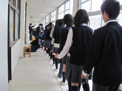 教室横の廊下に出て、クラス全員が一列になり足にムカデのひもを括り付けて、足並みをそろえる練習をお子ないました。