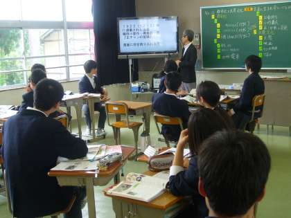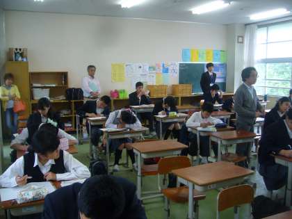 教室の後ろや入口のところに、保護者が立たれて生徒たちは幾分緊張気味で、1年生は理科の少人数分割授業、2年生は数学と英語の少人数分割授業でした。