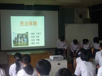 3年生49名が、14軒の民家に2名から3名で分宿し、家族同様に生活していろいろな体験をさせてもらったことをスライドにまとめて報告しました。
