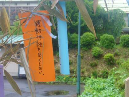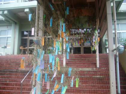 あいにく朝から雨ですが、生徒棟と管理棟の間の渡り廊下に笹が取り付けてあり、全校生徒の願い事の書かれた短冊が取り付けられています。