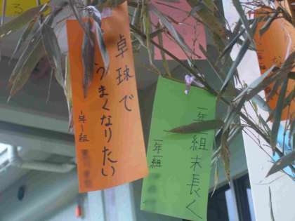 それぞれ一人2枚の短冊を書き、1枚は自分の願い事、もう1枚は社会や学校全体にかかわる内容を願い事として書いてもらって笹の葉につるしています。