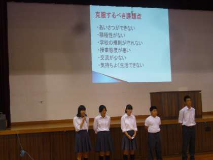 8月25日(金)の全校集会の最後に、8月21日・22日に実施されたリーダー研修会の報告会が、参加した生徒の人たちの手で行われました。