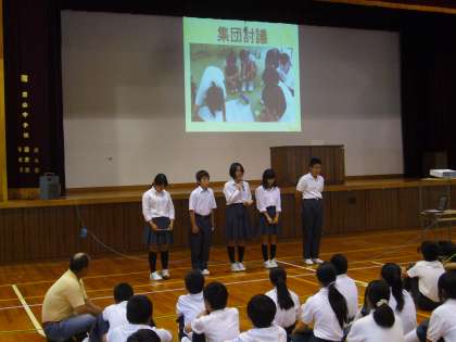 司会者の指示で、アイスブレイク担当、レクレーション担当、話し方担当、集団討議担当、小学生との交流担当等の人たちからスライドやポスター、ブレインストーミングの結果整理された表を提示しながら報告が行われました。