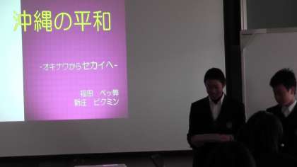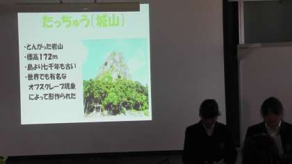 会では各グループが、「沖縄の平和」「沖縄戦について」「沖縄の方言や伝統行事」「沖縄の文化や自然」「沖縄や伊江島の食べ物や料理」「沖縄の特産品」等について調べて、スライドにまとめて発表してくれました。