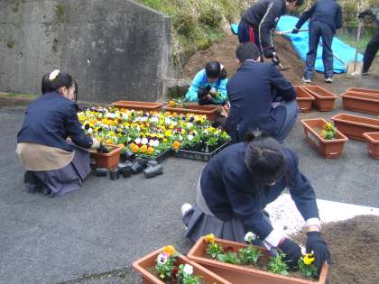 それに向けて4月8日(水)から10日(金)の間に、生徒会執行部と生活部が中心となって、今まで球根や種から育てた苗等を地域の業者の方に指導をお願いして、プランターに植え替える作業を行っています。