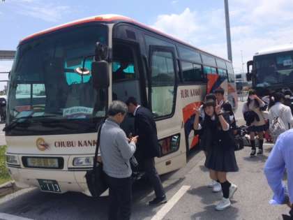 この後、空港からバスに乗り換えます。車内で持参した昼食を食べて途中休憩を取りながら、一路本部港をめざし出発です。