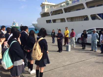 フェリーから下船して各自荷物を受け取った後、岸壁で「入村式」が始まりました。
