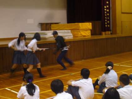京北交番の方から、刺又やパイプ椅子を使っての防御の仕方の実演を見学したり、実際に先生や生徒が体験したりしました。