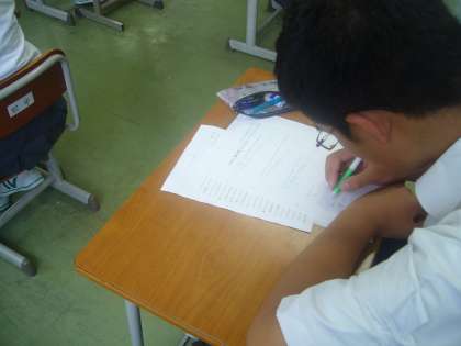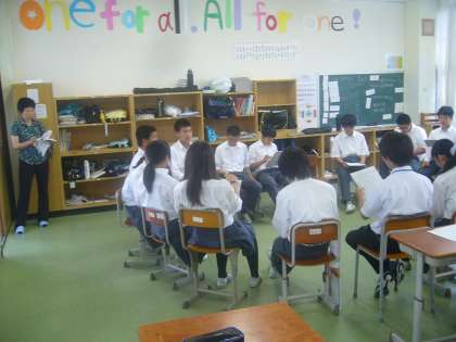 各クラスの教室では、前時に読んだ資料や視聴覚教材を元に、話し合った内容や感想を書いて発表したり、配付された資料を使ってグループや全体で自由に意見を出し合ったり、資料をもとに賛成反対の意見を出して理解を深めたりしていました。