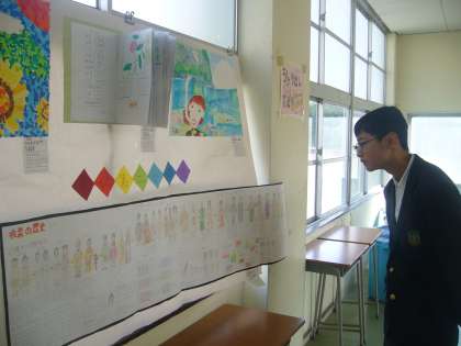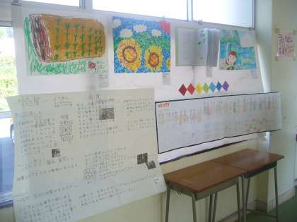 今週周山中学校には、京北第二小学校の児童の絵画や研究作品6点が、生徒昇降口に掲示されています。