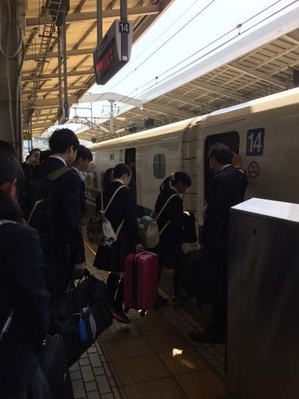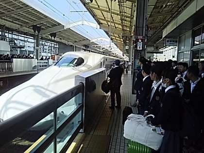 京都駅の新幹線ホームに「のぞみ218号」が到着し、いよいよみんな乗り込みます。