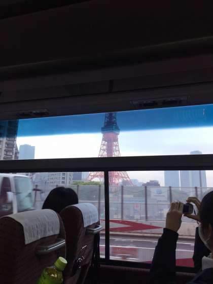 東京都内に入ってからのバスの車窓からの景色です。「レインボーブリッジ」、「お台場フジテレビのビル」、「東京タワー」が間近に見えます。