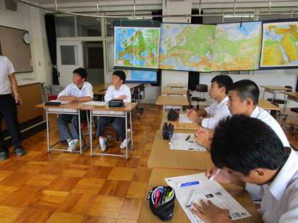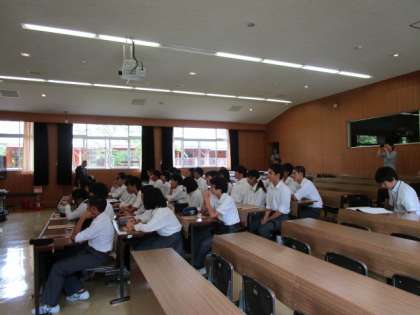当日周山中学校からハスで高校に移動し、まず全員で「北桑田高校ってどんな学校?」という説明をお聞きしました。